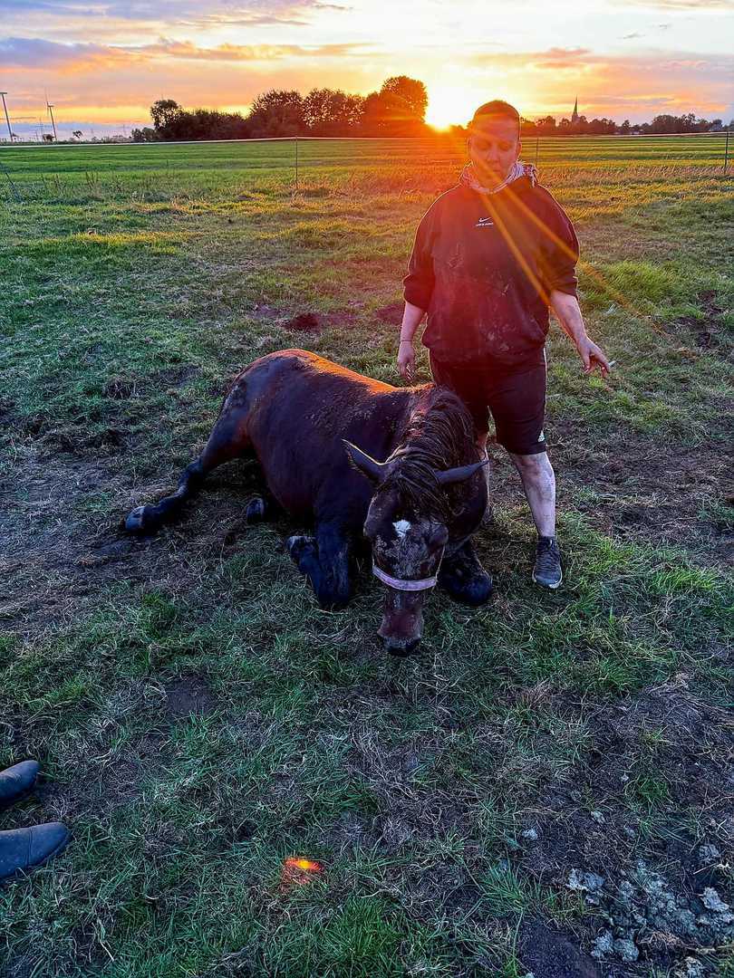 Sie hatte auf der Weide am Tag der Abholung einen Unfall und steckte in einem Matschgraben fest.